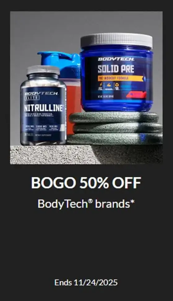 Hurry in and buy one, get one 50% off BodyTech brands in store for a limited time.